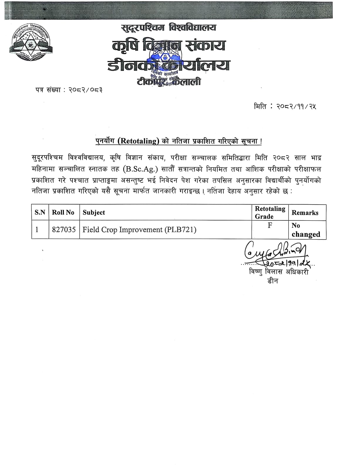 “पुनर्योग (Retotaling) को नतिजा प्रकाशित गरिएको सम्बन्धमा सूचना।”